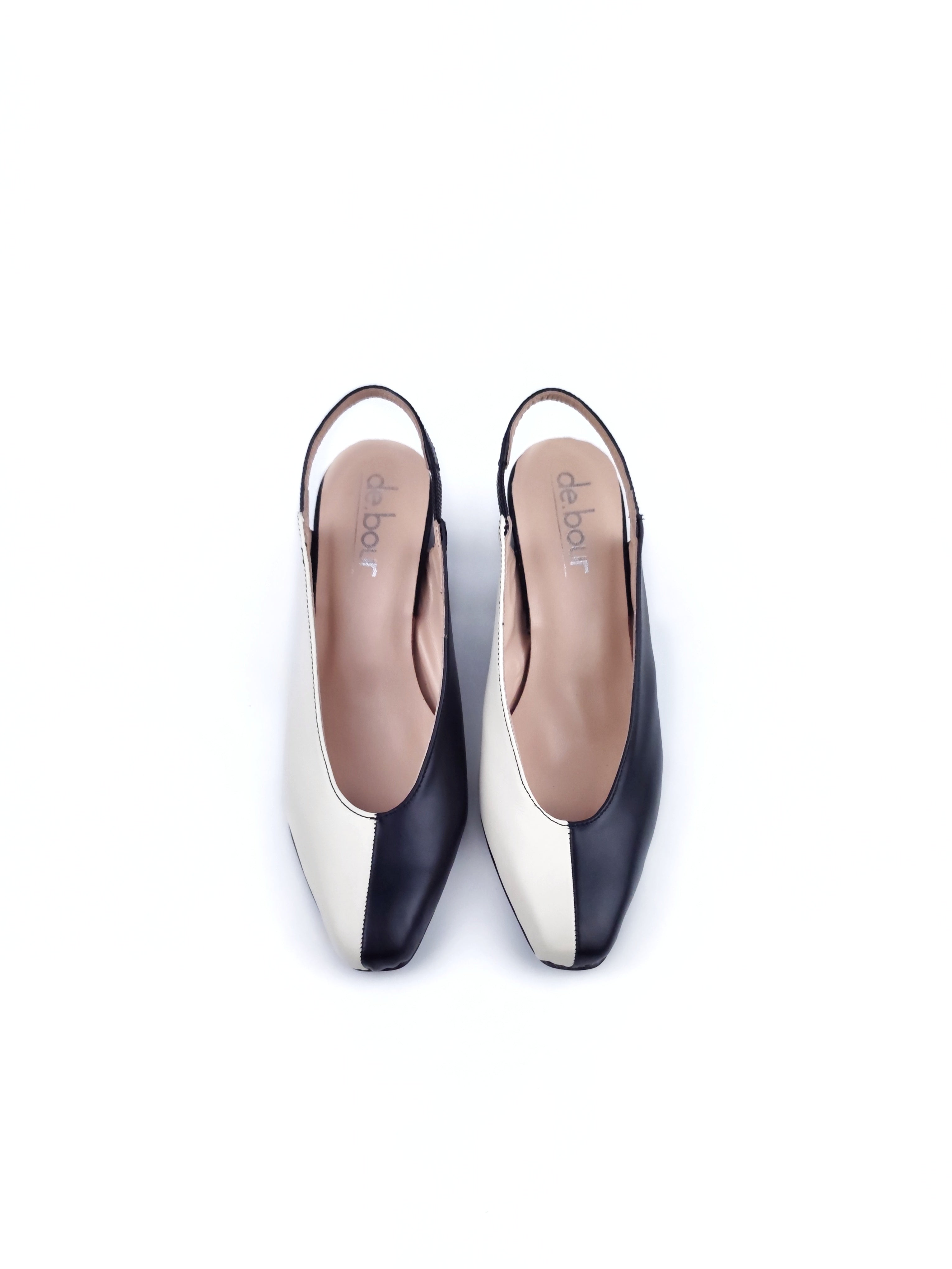 Handmade leather slingback pumps in a bold and classic contrasting combination.
